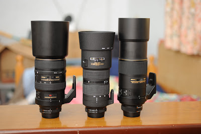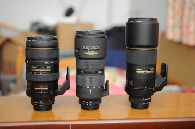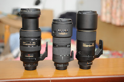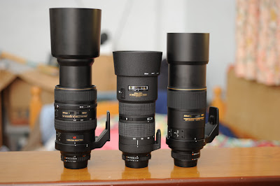 下、把nikon 80-400mm f4.5~5.6、nikon 80-200mm f2.8、nikon 300mm f4拿出來合照一下,很容易的看出來,300mm f4這一顆是最長的,腰圍也是最細的!如果從規格上來看,從左到右的重量分別是:1360g、1300g、1440g(含三角支架140g),所以,300mm f4是這三顆鏡頭中最重,也是最長的一顆鏡頭。