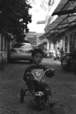 下、弟弟在巷子內騎腳踏車。