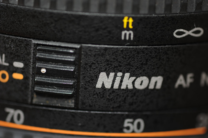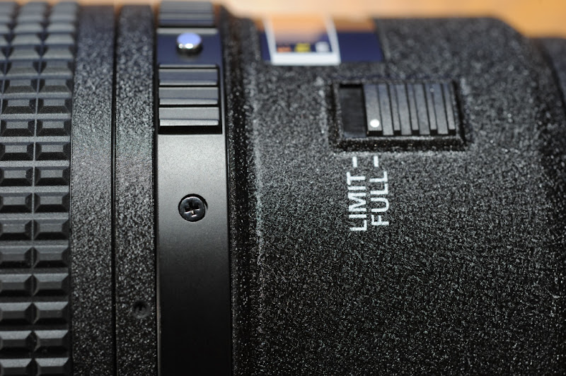 下:LIMIT/FULL的對焦轉換開關的按鍵和M/A環,還有距離刻度屏和景深指示器。對焦環的表皮面設計,這是NIKON鏡頭中我最喜歡的一種設計,我稱之為「鱷魚皮」。