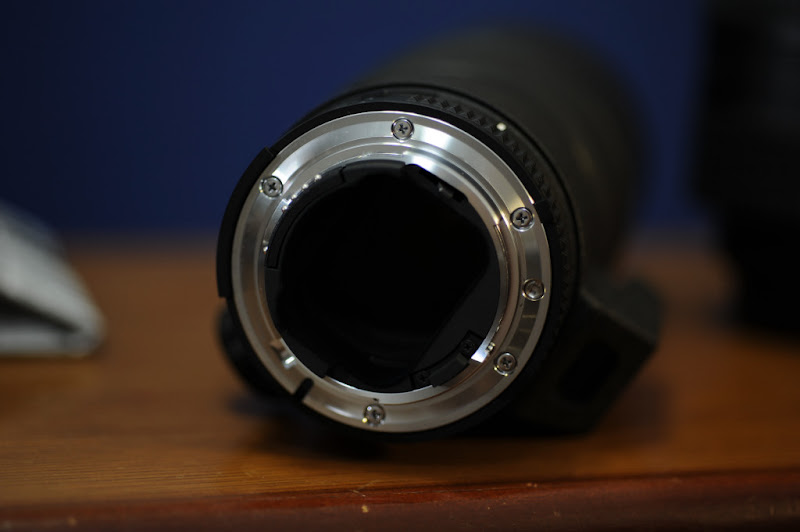 下:鏡尾的特寫。有cpu接環5顆、測光表耦合脊、自動對焦耦合器、最大光圈指示位、最小光圈確認位、光圈撥桿。鏡頭內部是絨布的設計。