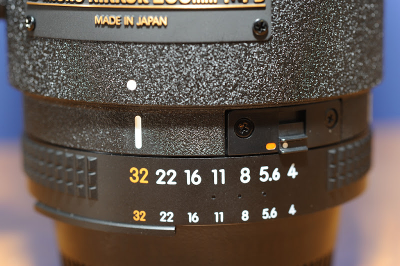 另外,它還有很奇怪設計的「最小光圈固定桿」,它和其它的NIKON鏡頭完全不一樣,加了一片鎖上螺絲的鐵皮。還有,光圈環上有3個小孔,跟一般的光圈環上只有2個小孔不一樣,孔的位置也不一樣。也許是因為它是微距鏡的關係?還是?
