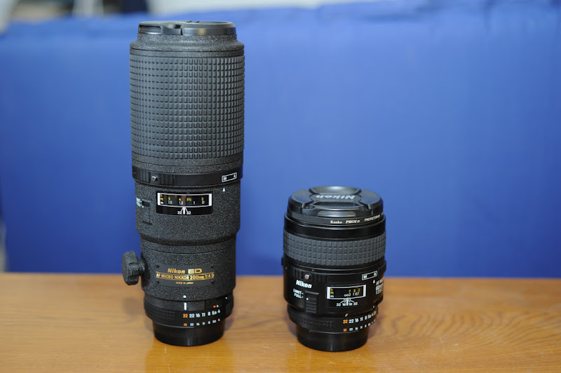 下:我的NIKON雙微,200微和60微。口徑一樣,都是62MM,長度可就差多了,一支193mm,一74.5mm。長度差距頗大,重量1193g vs 440克,不過,工作距離就差多了。50mm vs 22mm,真的差距很大。而這2支鏡頭通通是nikon在1993年發表的鏡頭,也是現在Nikon市售最古老的鏡之一。不過,像60mm這支,可是設計的非常堅固,很耐摔(我摔過,心痛呀!)
