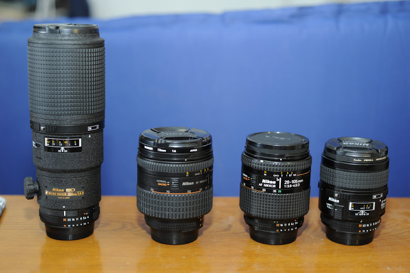 下:再把我所有微距功能的鏡頭通通放上來排排站。中間二支28-105和24-85只有1:2的放大率,60mm和200mm就有1:1的放大率了。