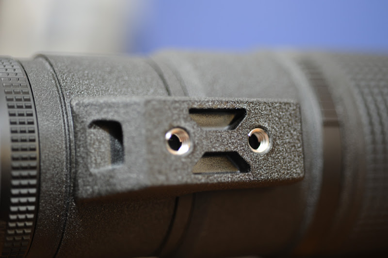 下:翻個身,再來一張照片。注意一下。在腳架環和光圈之間,總共有3條白線,這是給腳架環旋轉90度的標示,很容易讓人以為另外其它的白線是F接環的安裝指示標記。至少我已經弄錯幾次的經驗。