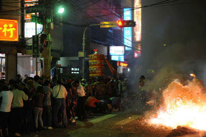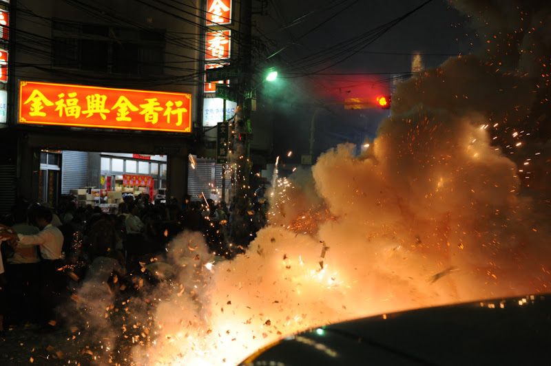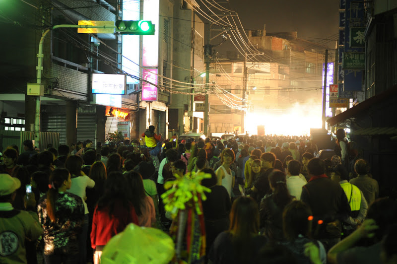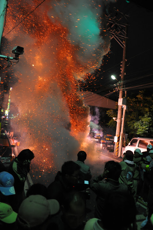 下:爆竹、煙火,照亮了整個大甲街上的夜空。