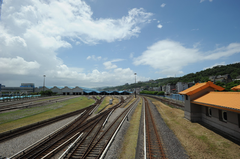 下:藍天,白雲的北投捷運機廠的軌道,這些軌道,接近仔細看,果真是1435cm的國際準軌。車子也寬多了!不過,到也沒有比TRA的火車寬多少!